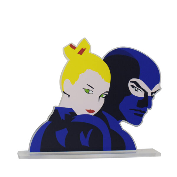 In questa creazione, i personaggi si fondono in un abbraccio simbolico, evocando un sentimento di unione e affinità reciproca.
