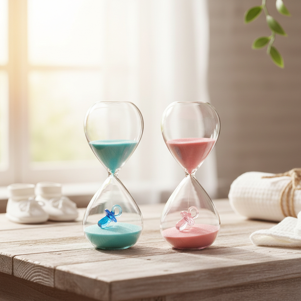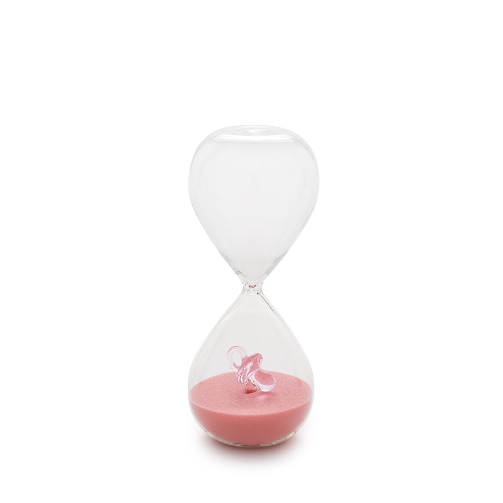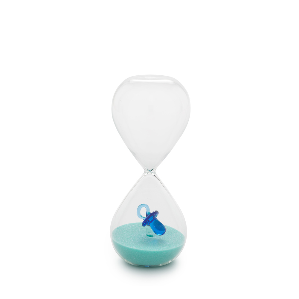 Realizzata con vetro trasparente di alta qualità, ogni clessidra racchiude al suo interno una fine sabbia colorata, disponibile nelle tenere tonalità dell’azzurro cielo o del rosa cipria. Ma il vero tocco distintivo è il piccolo ciuccio in miniatura, accuratamente posizionato all’interno della sfera inferiore, che aggiunge un’aura di dolcezza e anticipazione.