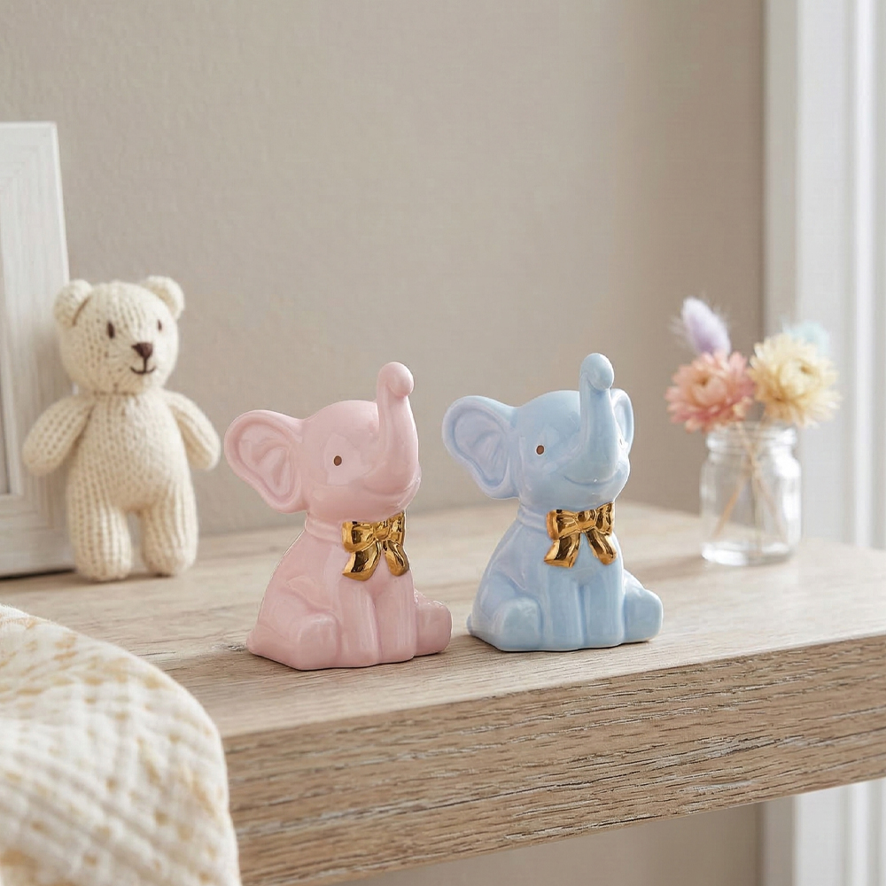 Disponibile nelle delicate nuance del rosa pastello e dell’azzurro cielo, l’elefantino è ideale come complemento d’arredo per la cameretta o come bomboniera raffinata per celebrare momenti indimenticabili come nascite, battesimi e compleanni. Un pensiero dolce e senza tempo che saprà emozionare chi lo riceve.