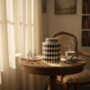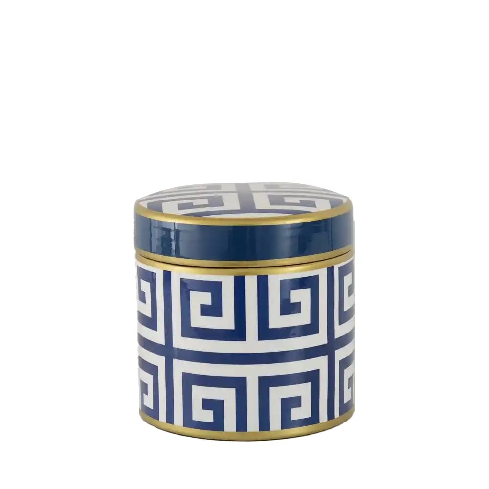 La scatola tonda in ceramica con trama greca della linea Fancy è un elegante oggetto decorativo e funzionale.