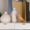 La scultura è sostenuta da un piedino in legno, che fornisce una base stabile e naturale. Questo piedino in legno contrasta con la porcellana lucida o opaca dell’uccello, creando un equilibrio visivo e un aspetto complessivo sofisticato.