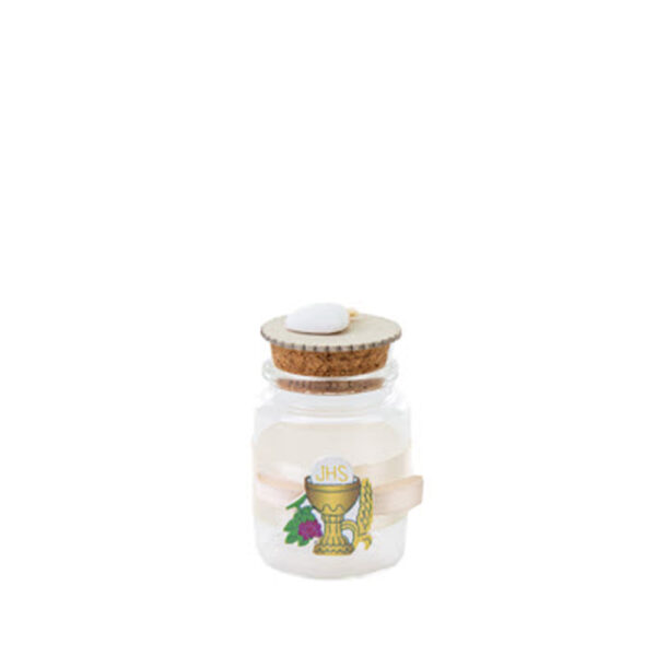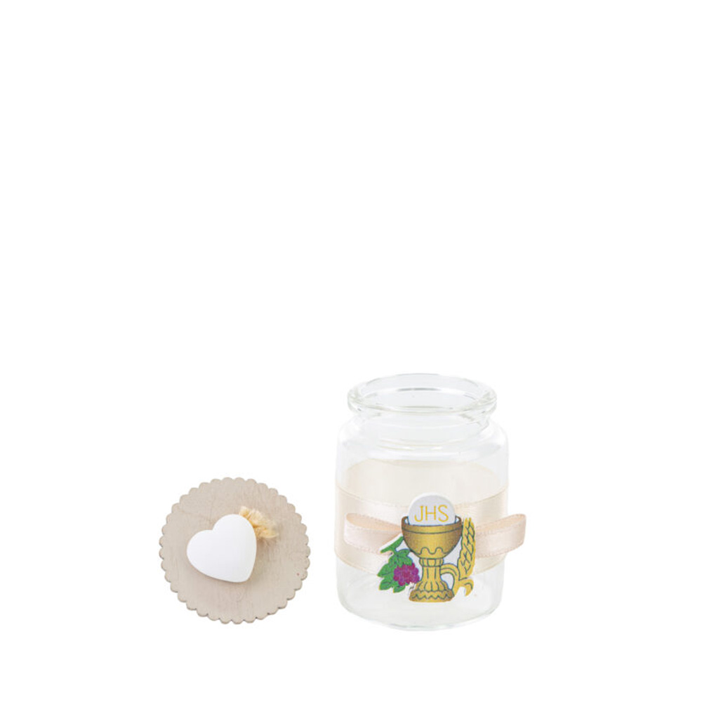 Le Stelle presenta un delizioso barattolo in vetro con 5 confetti, impreziosito da un grazioso decoro calice.