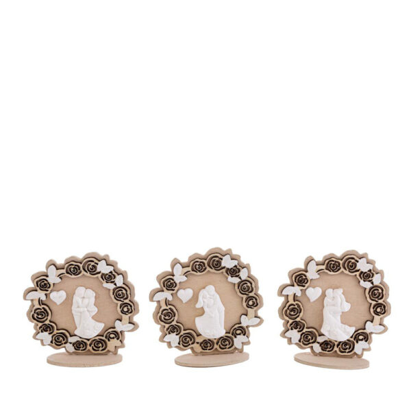 Ogni segnaposto è realizzato in legno , caldo e accogliente, che fa da sfondo a una delicata scultura in gesso raffigurante due teneri sposini.