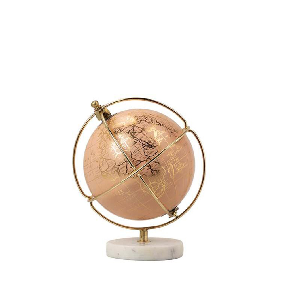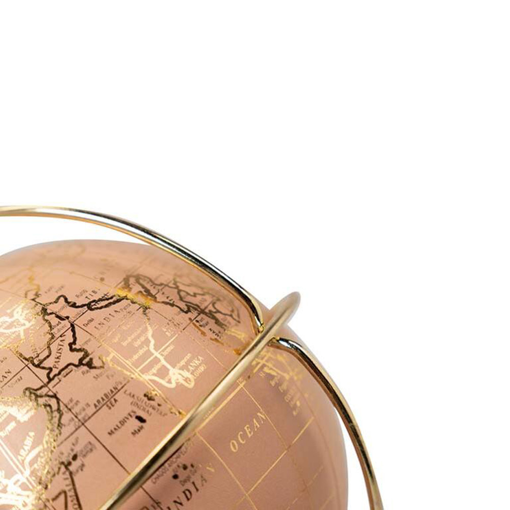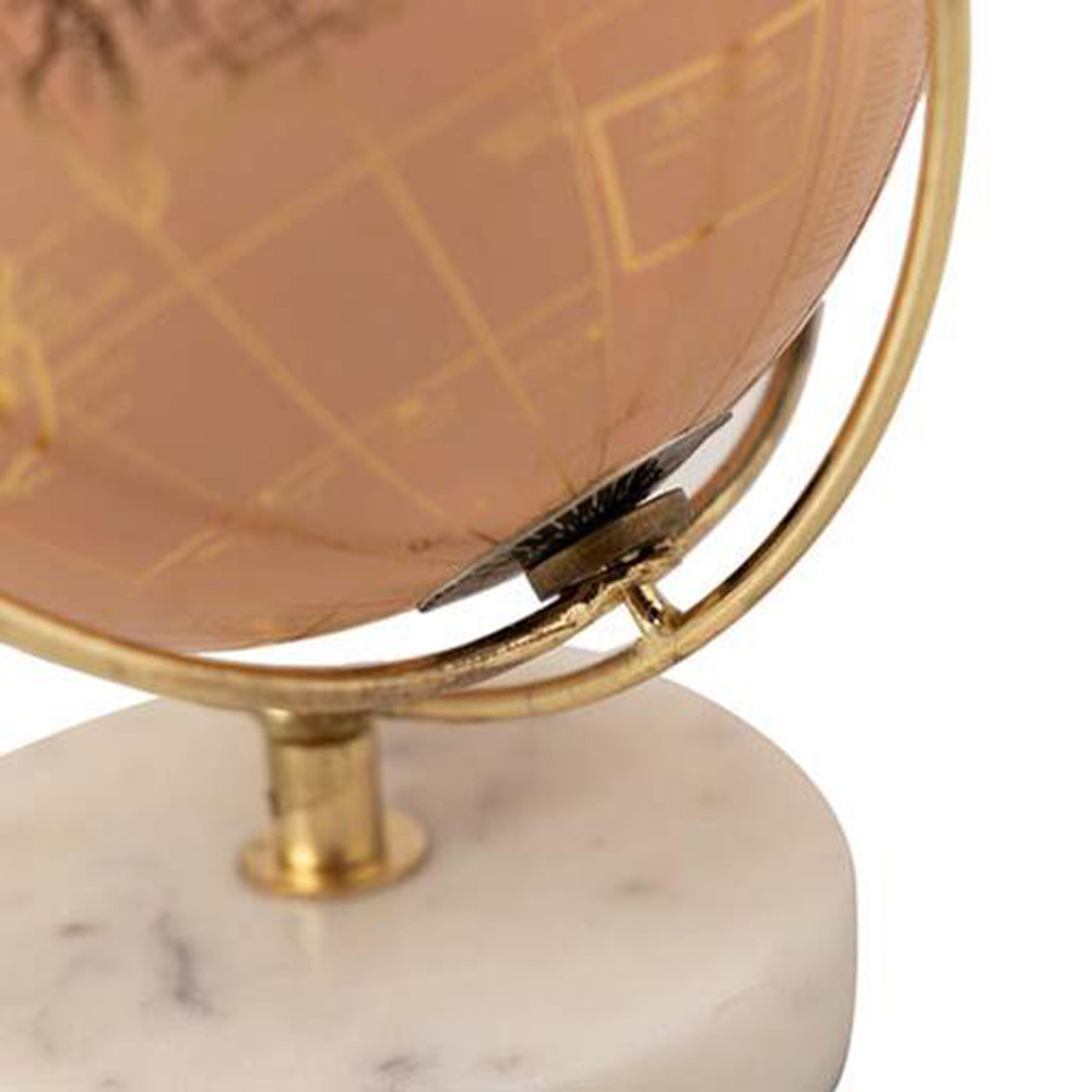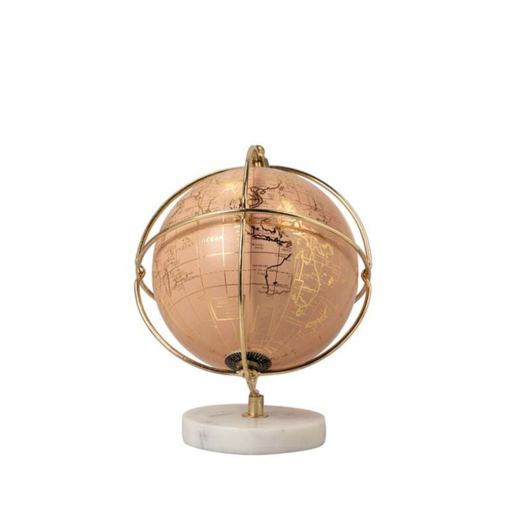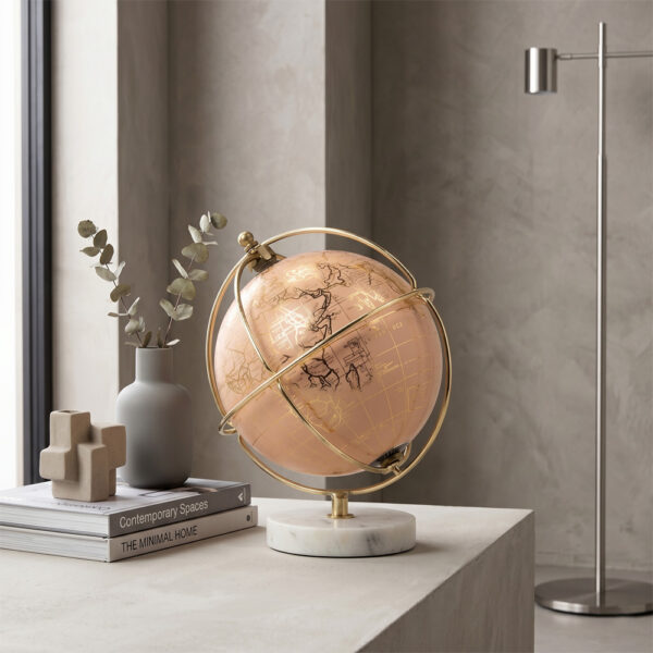 Caratterizzato da una delicata sfera nei toni del rosa cipria con dettagli dorati, il mappamondo è sostenuto da una struttura metallica sottile e poggia su una solida base in marmo bianco, che ne garantisce stabilità e pregio estetico.