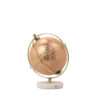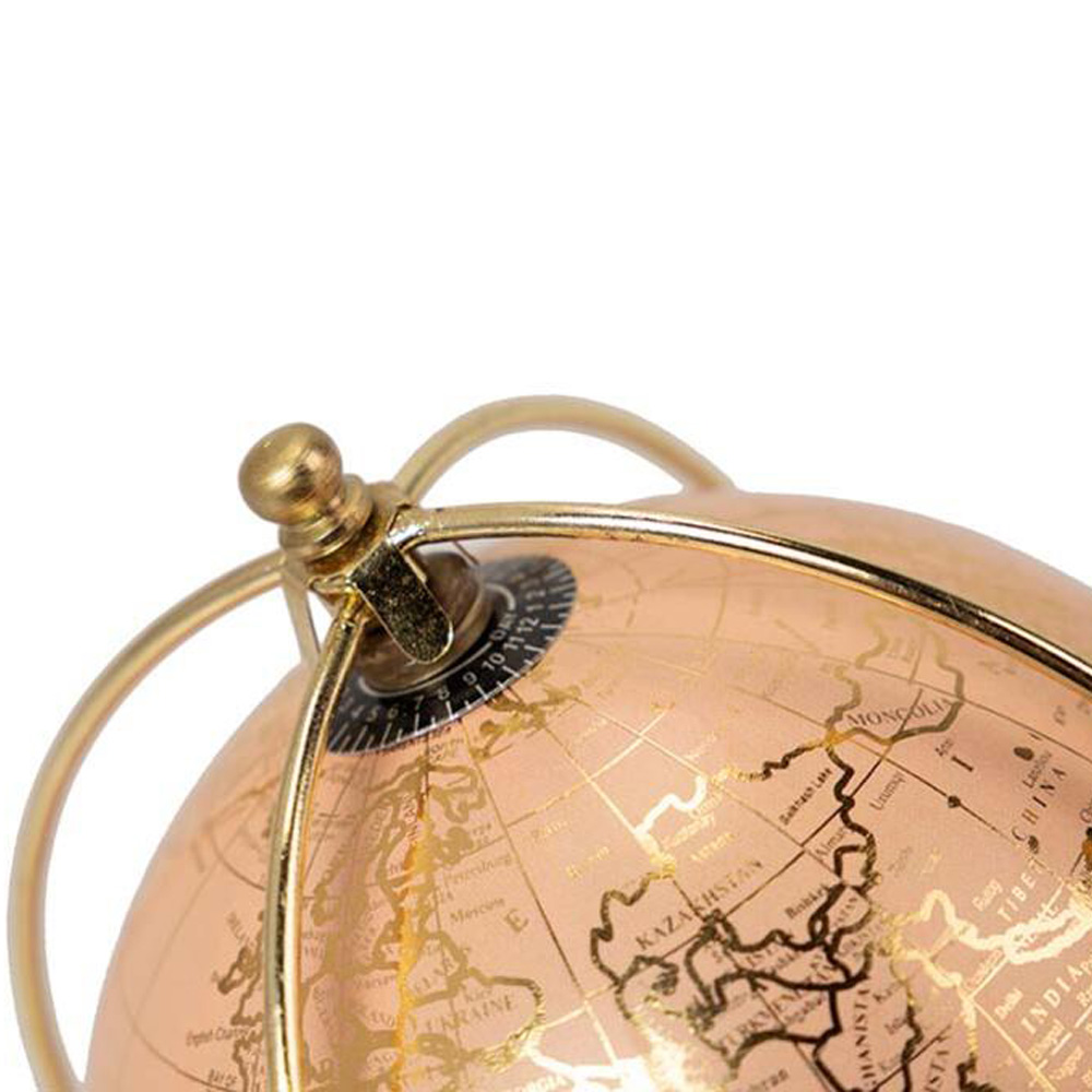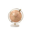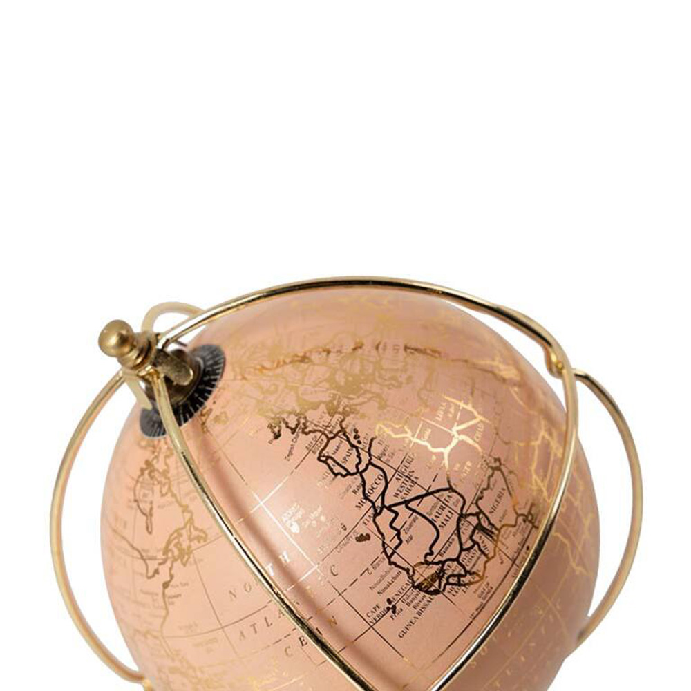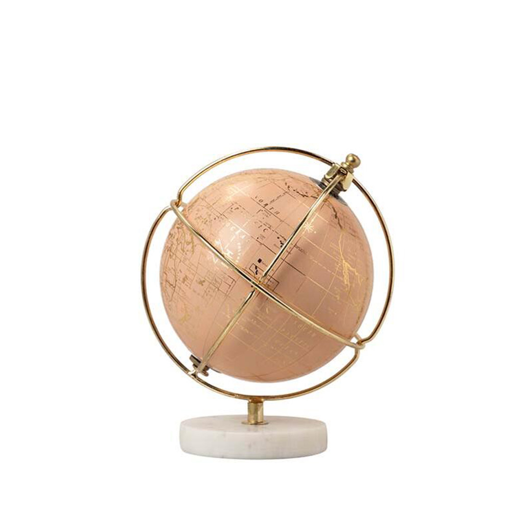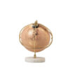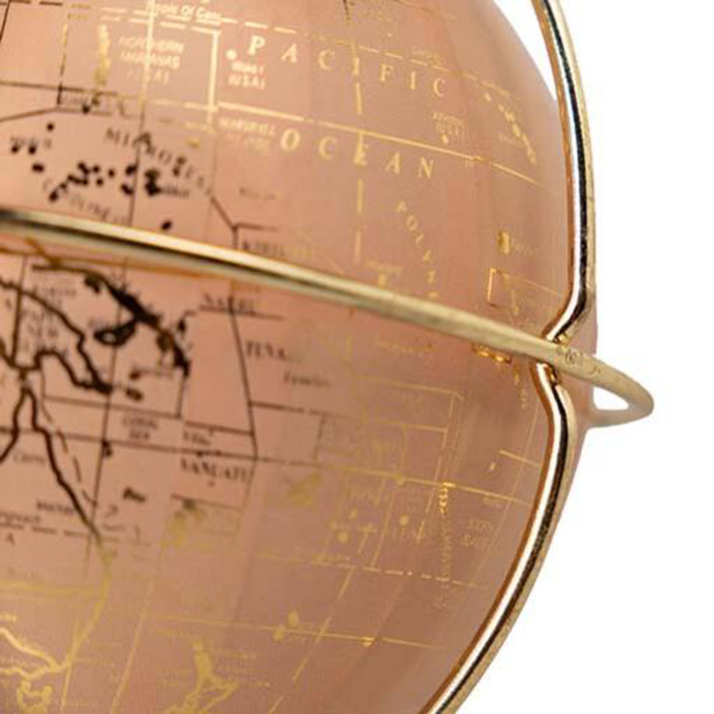 Caratterizzato da una delicata sfera nei toni del rosa cipria con dettagli dorati, il mappamondo è sostenuto da una struttura metallica sottile e poggia su una solida base in marmo bianco, che ne garantisce stabilità e pregio estetico.