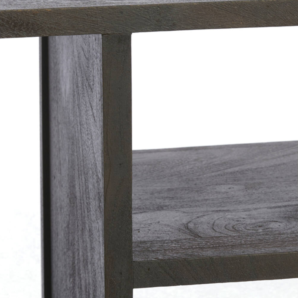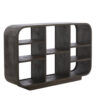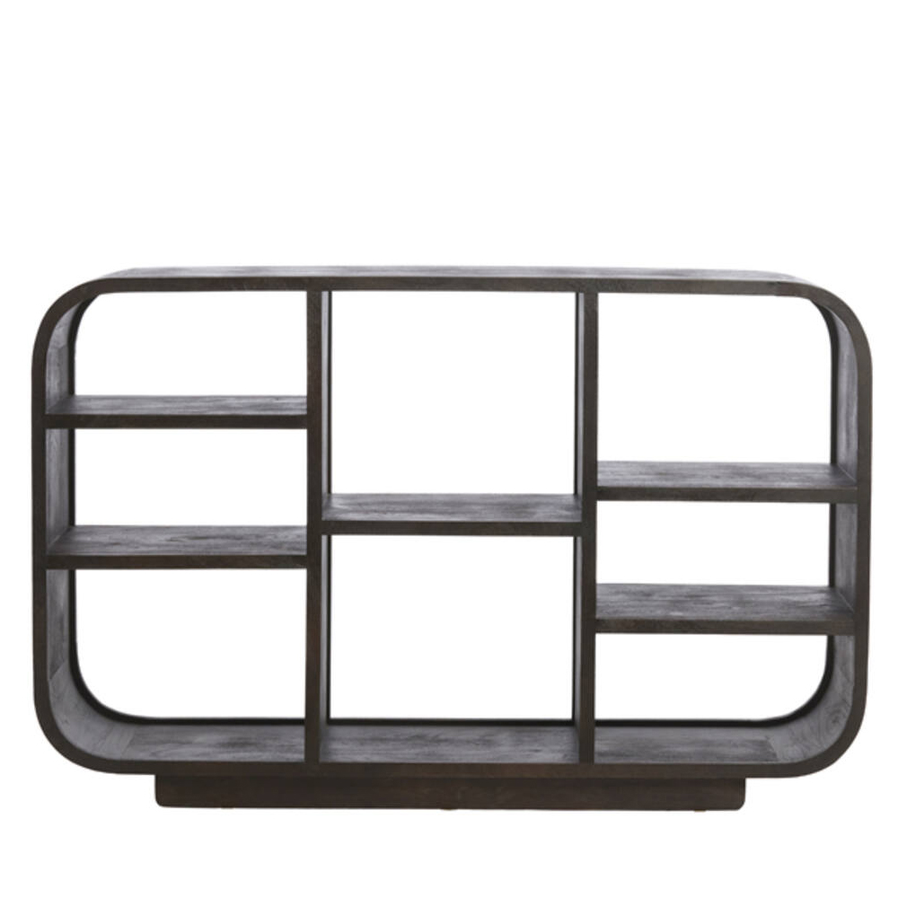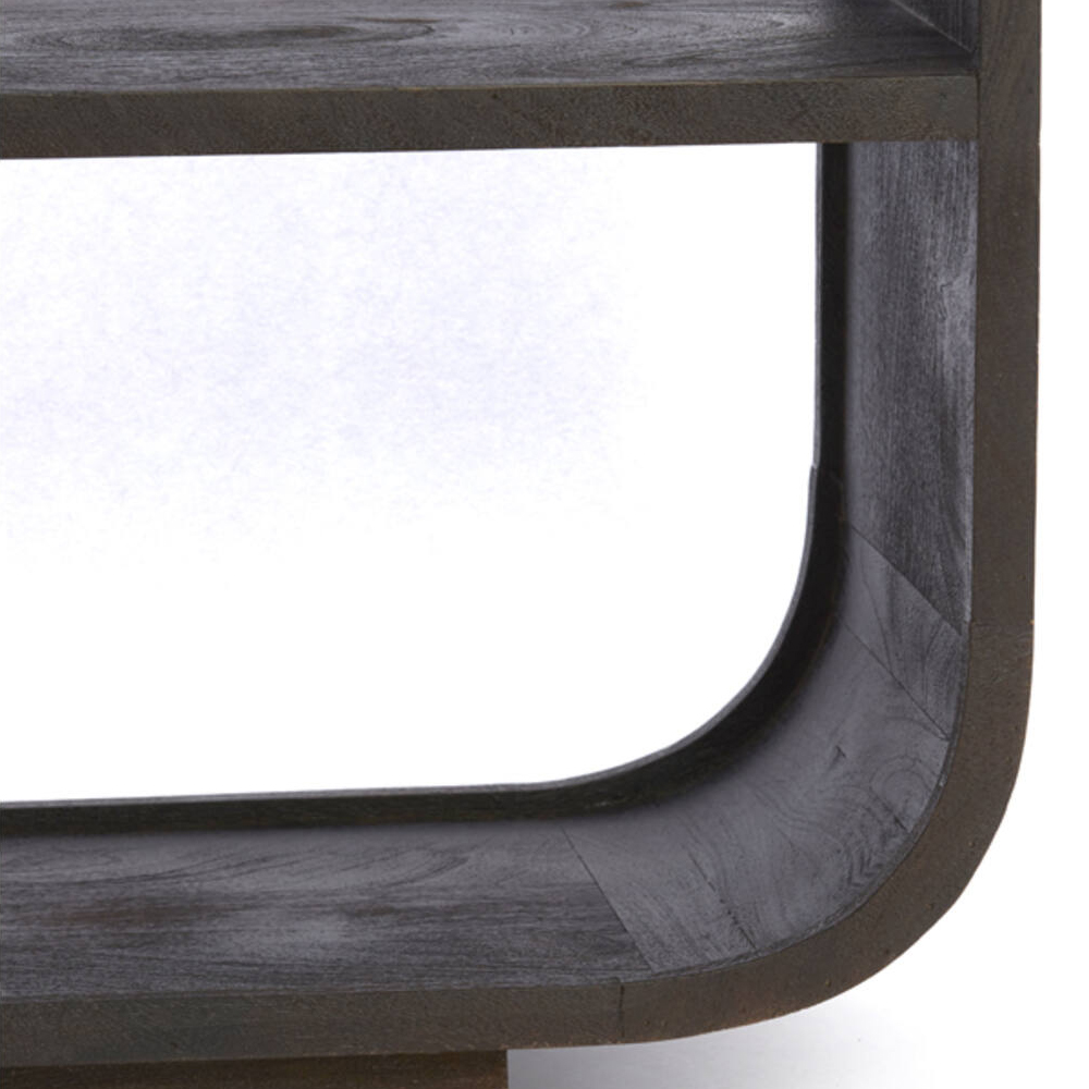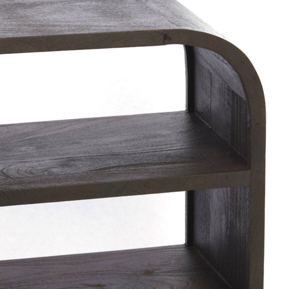 Realizzato in legno con finitura russet scuro opaco, questo pezzo iconico presenta angoli arrotondati e ripiani aperti che uniscono stile e funzionalità.