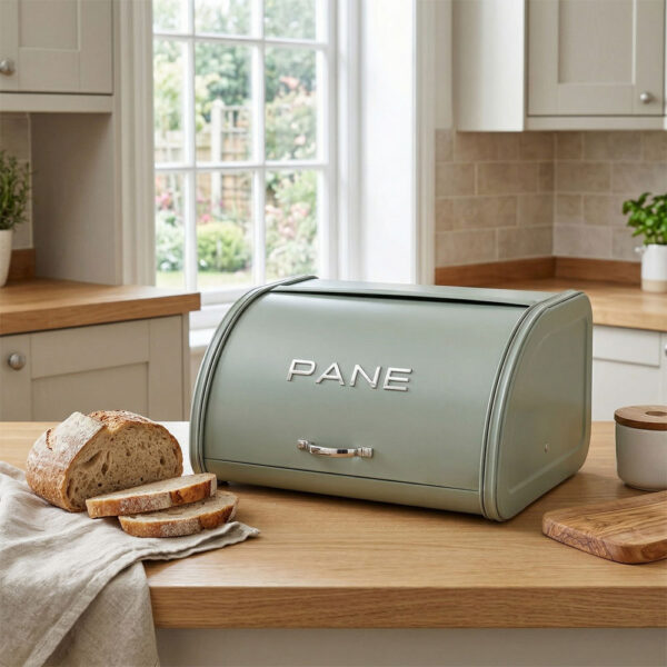 Realizzato in ferro resistente nella delicata tonalità verde salvia, si distingue per la scritta “PANE” in rilievo cromato e una finitura satinata che dona un tocco di eleganza senza tempo a ogni bancone.