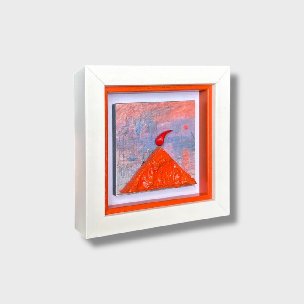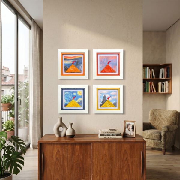 La collezione Allerìa trasforma l’icona del Vesuvio in un palcoscenico di pura emozione cromatica. In questi quadretti materici in 3D, la sagoma del vulcano — impreziosita dal caratteristico cornetto portafortuna sulla cima — si staglia su sfondi ispirati ai capolavori che hanno fatto la storia dell’arte.