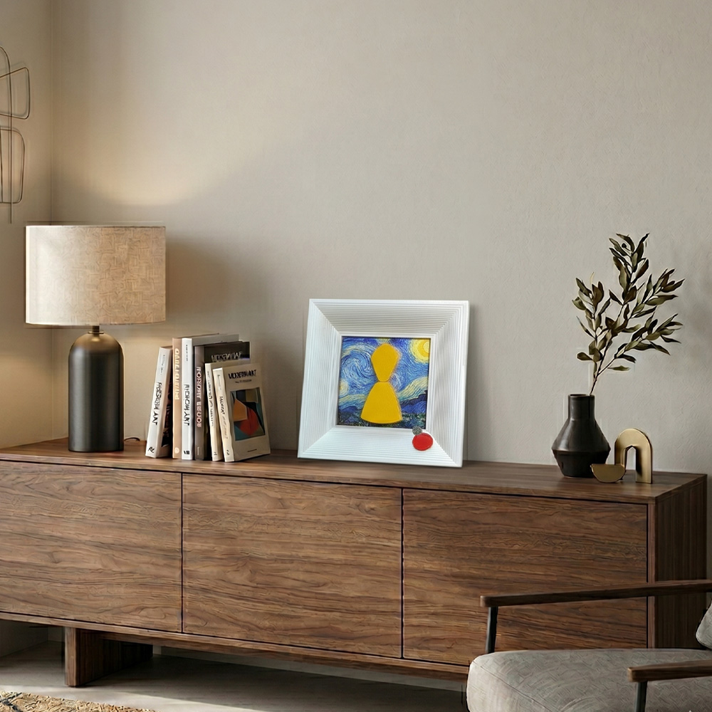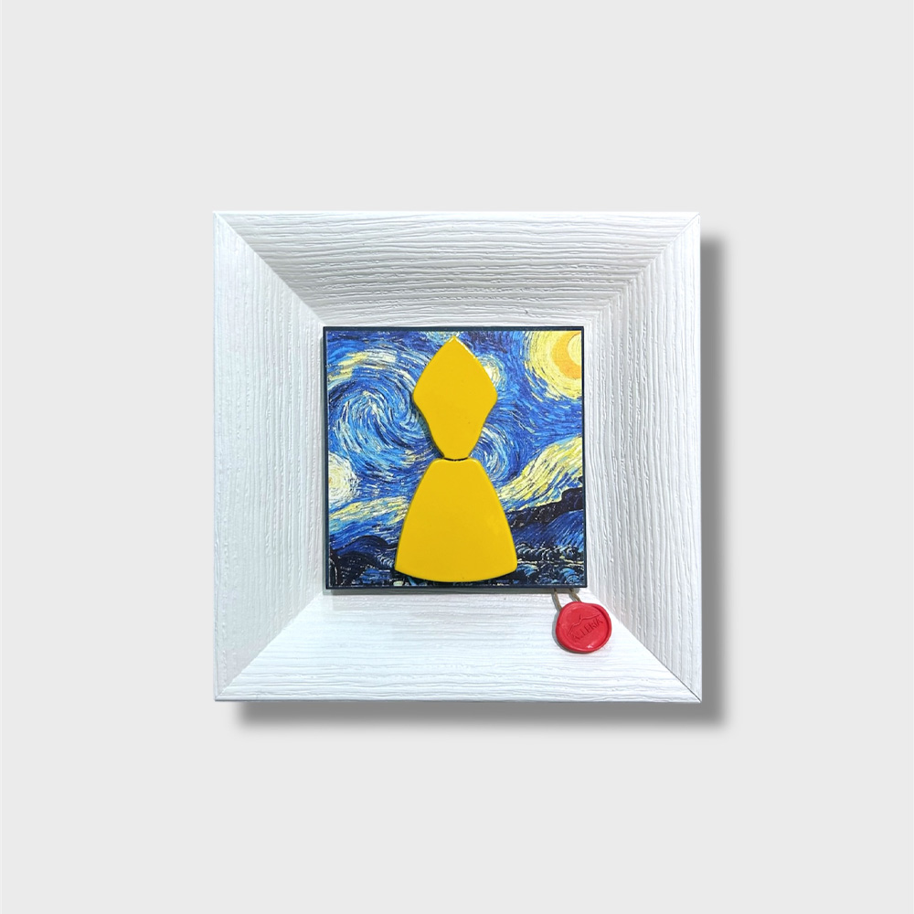 Questo quadretto unico fonde l’iconica figura di San Gennaro con il celebre sfondo della “Notte Stellata” di Vincent van Gogh.