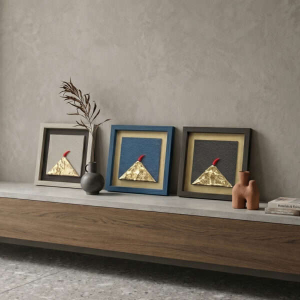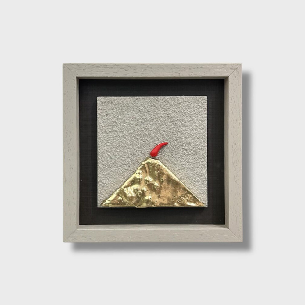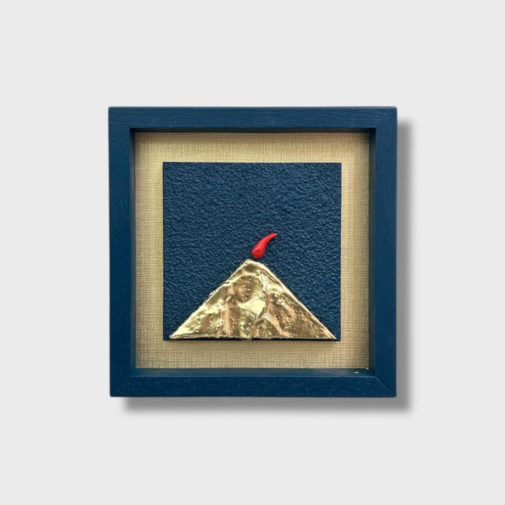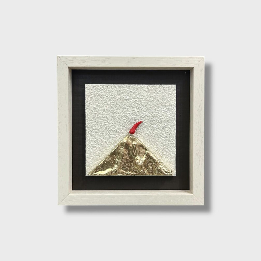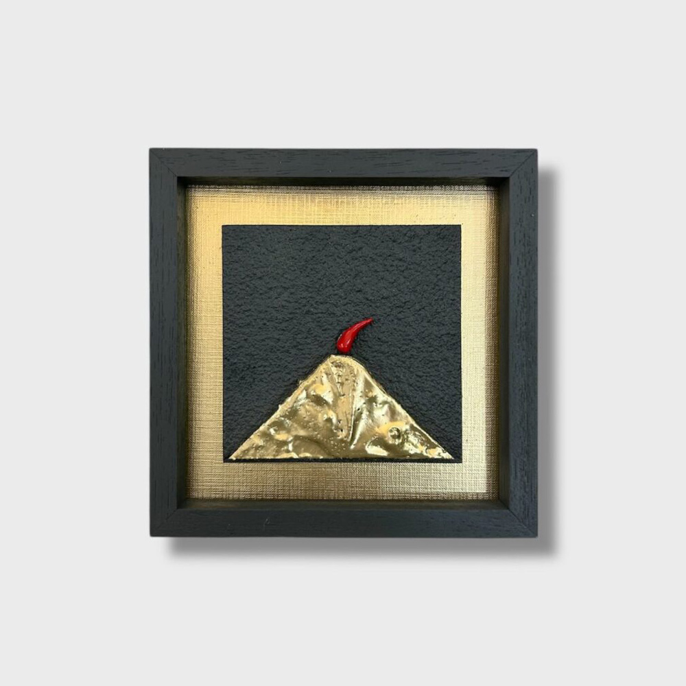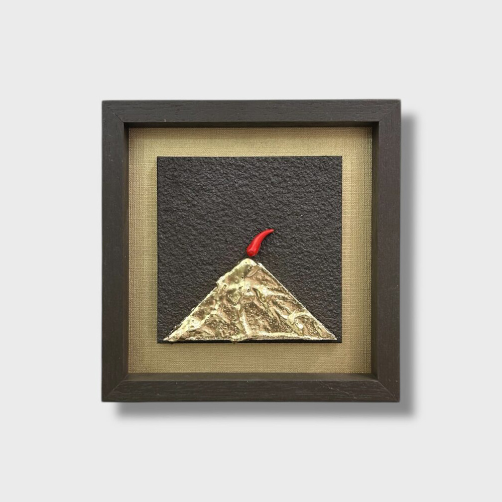 Ogni opera rappresenta il profilo del Vesuvio, realizzato con una preziosa finitura dorata e impreziosito dall’iconico cornetto rosso, simbolo universale di fortuna e protezione.