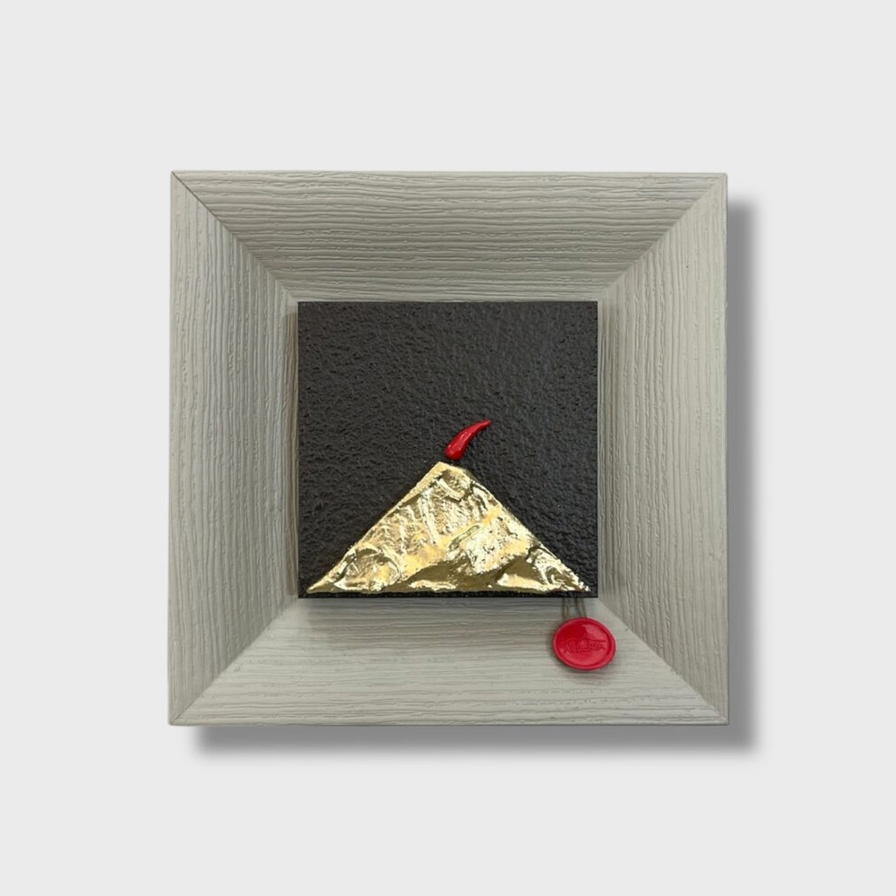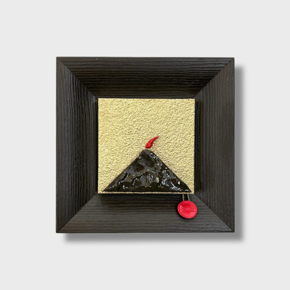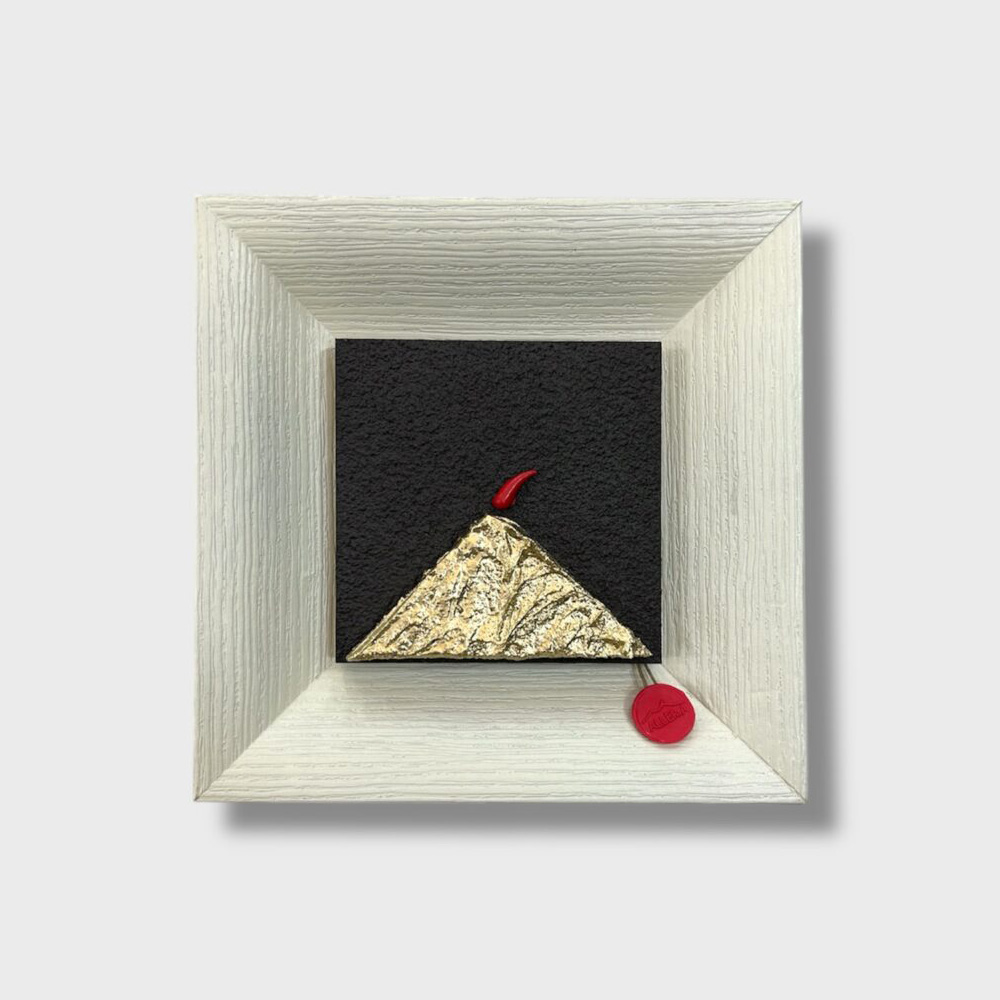 Ogni opera rappresenta il profilo del Vesuvio, realizzato con una preziosa finitura dorata e impreziosito dall’iconico cornetto rosso, simbolo universale di fortuna e protezione.