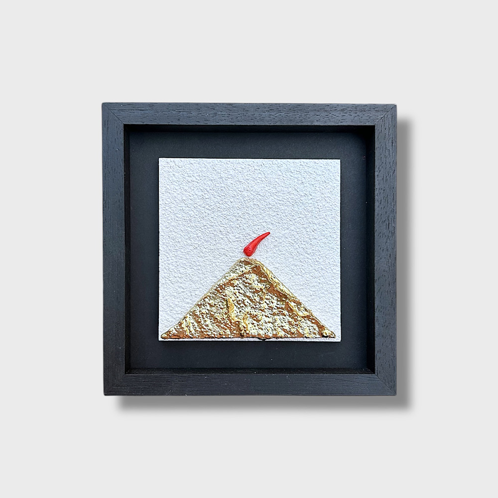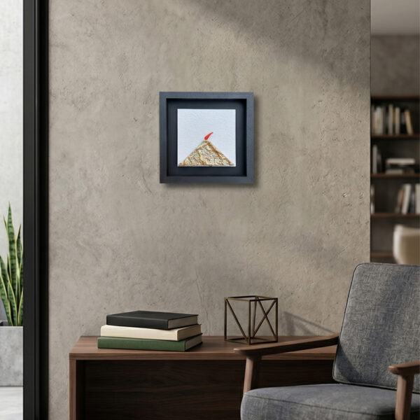 L’energia del vulcano incontra l’eleganza del design contemporaneo. Questo esclusivo quadretto 20×20 cm reinterpreta l’icona del Vesuvio attraverso un audace contrasto cromatico e materico. La sagoma del vulcano, realizzata in un oro caldo e materico, emerge con forza da un fondo in bianco vibrante, che cattura la luce e dona profondità all’ambiente.