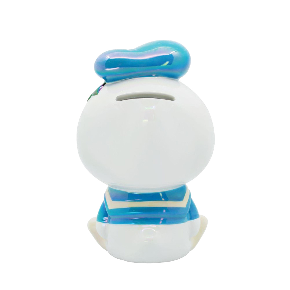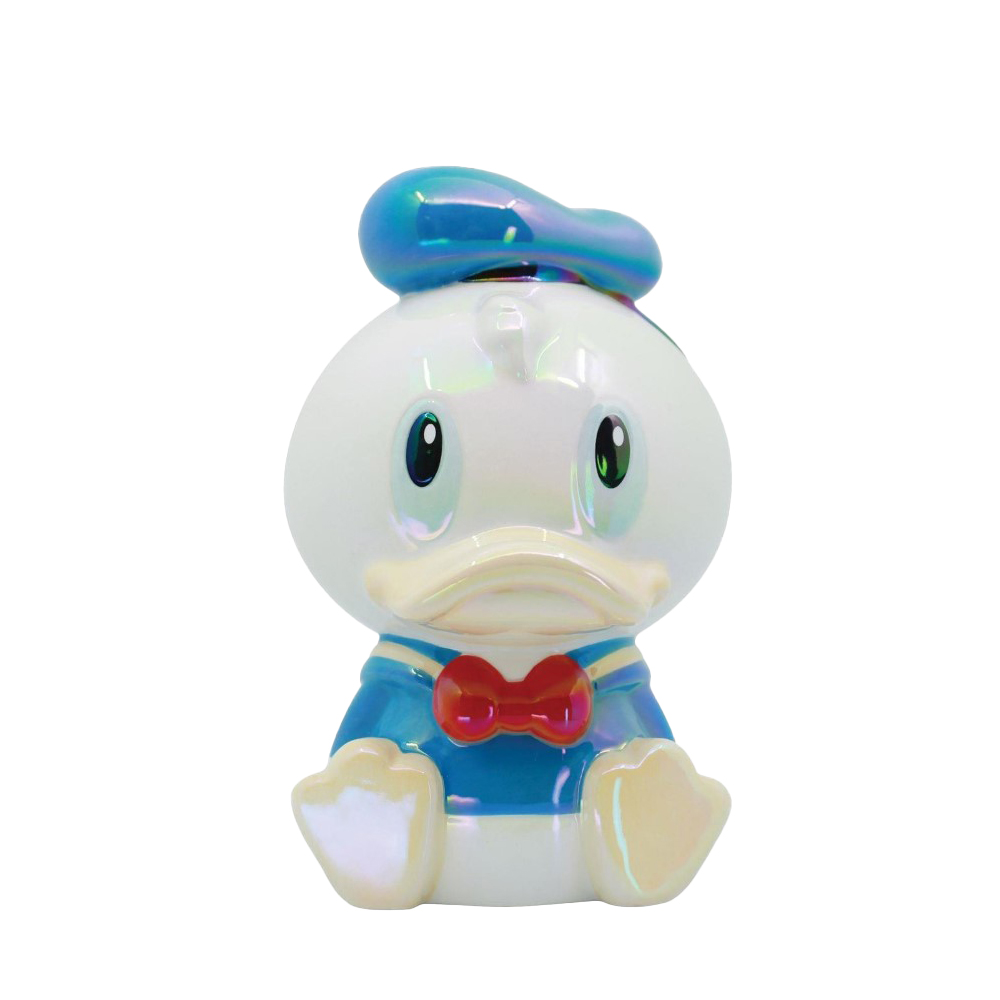 Realizzato in materiale ceramico iridescente, il salvadanaio riproduce con grande cura dei dettagli il celebre personaggio Disney, con la sua inconfondibile espressione imbronciata, il berretto da marinaio e il papillon rosso. I colori vivaci e le finiture lucide lo rendono un oggetto riconoscibile e accattivante.