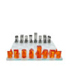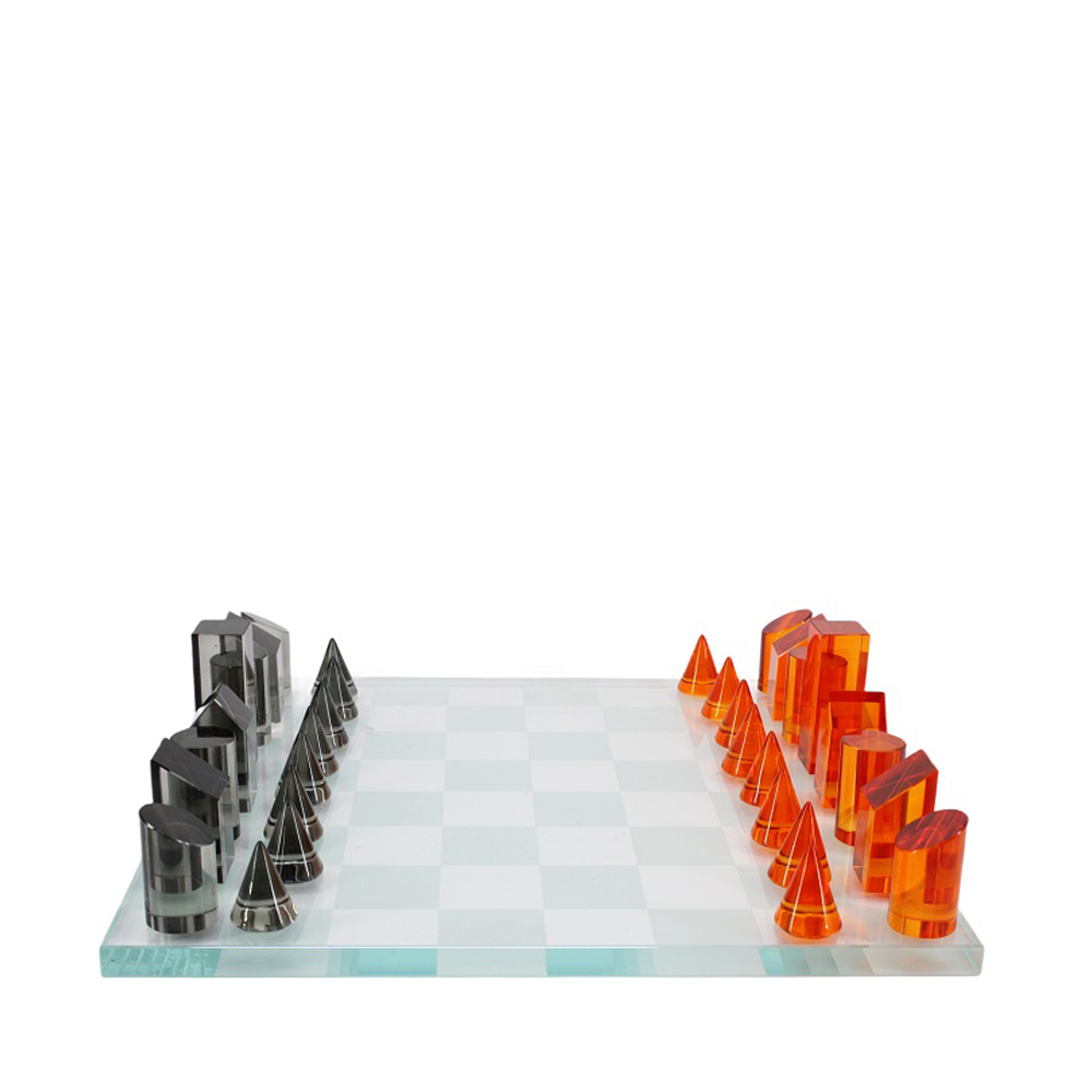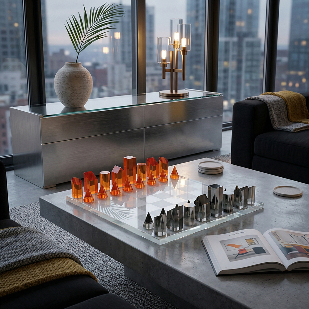Trasforma la sfida strategica in un’esperienza puramente estetica. La Scacchiera Metropoli della linea Fancy Home Collection è un tributo all’architettura contemporanea e al design d’avanguardia. Caratterizzata da una base in cristallo acrilico ad alta trasparenza, ospita pedine dalle forme geometriche essenziali che reinterpretano lo skyline di una città futuristica.