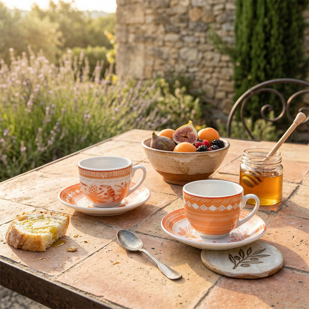 Accendi il tuo risveglio con il calore e la vitalità del set da due tazzine con piattino della linea Tuka Brandani, qui proposta in una vibrante tonalità arancio.