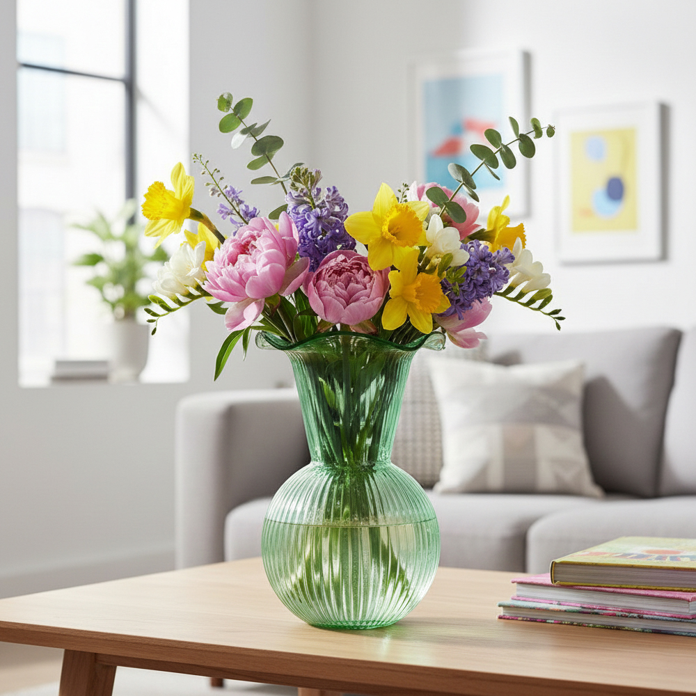 Questo pezzo iconico si distingue per il suo design armonioso, caratterizzato da una base sferica che si apre in un collo slanciato e una bocca ondulata, ideale per accogliere ricchi bouquet primaverili o composizioni floreali strutturate.