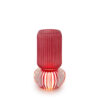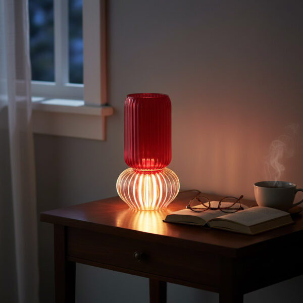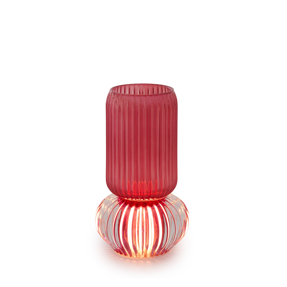 Realizzato in vetro lavorato con una delicata texture a coste, si distingue per il gioco cromatico tra la base trasparente e la sommità rosso cardinale.
