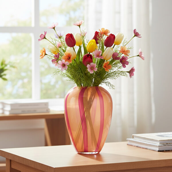 Caratterizzato da una silhouette slanciata e armoniosa , questo vaso si distingue per il suo gioco di trasparenze e tonalità calde. La finitura ambrata è impreziosita da eleganti bande verticali in contrasto, che creano un ritmo visivo sofisticato, perfetto per esaltare sia bouquet colorati che composizioni più minimaliste di tulipani e fiori di campo.