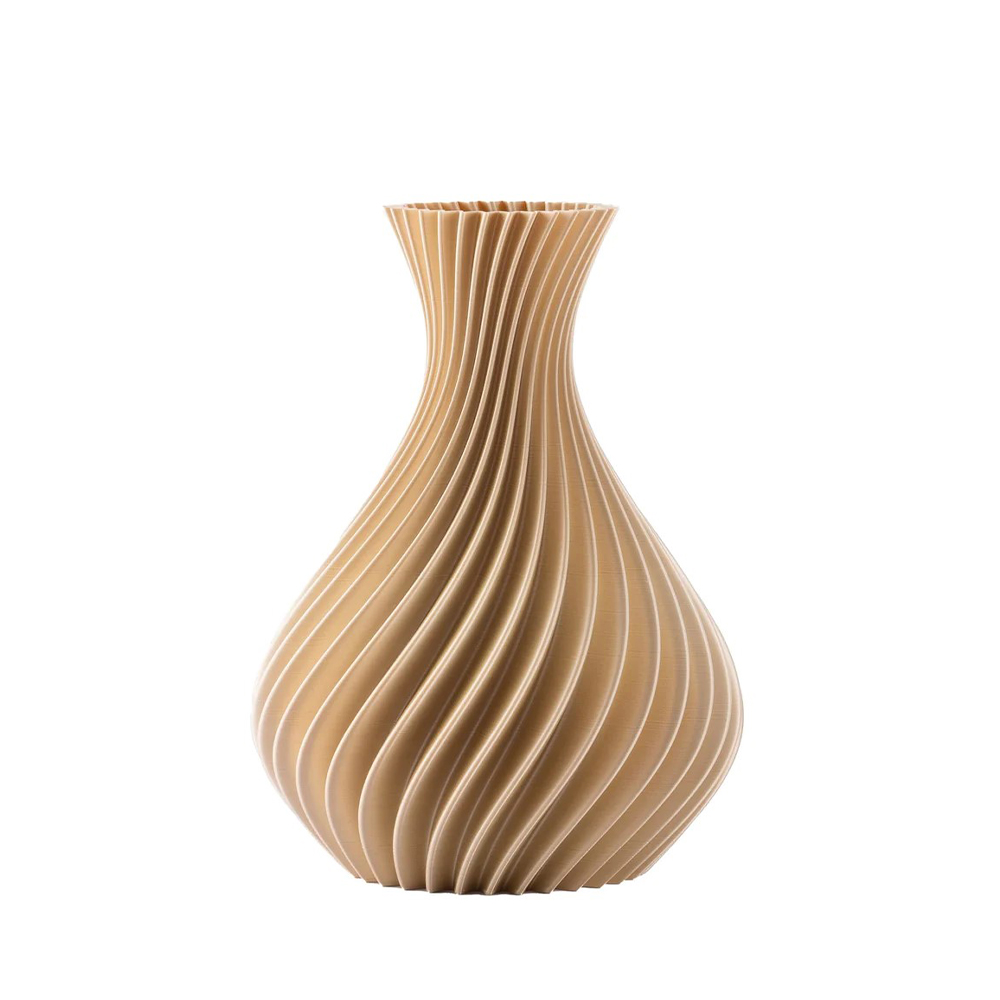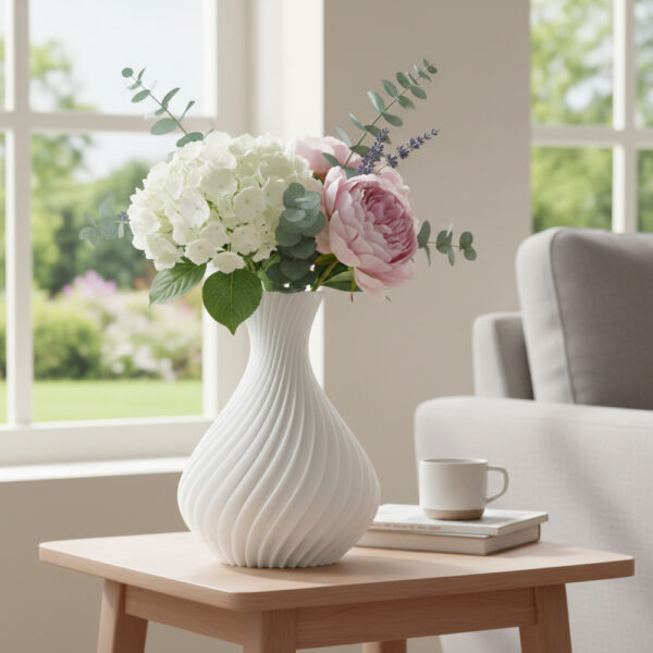 - Torsione Scultorea Perfetta: Il corpo del vaso è definito da linee elicoidali fluide e continue che avvolgono la silhouette a goccia. Questo disegno crea un effetto ottico tridimensionale che conferisce al pezzo un aspetto dinamico, quasi fosse in perpetuo movimento.
